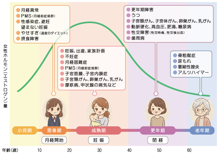 女性のライフサイクルは、女性ホルモン(エストロゲン)の分泌量の変化によって大きく4つのステージに分かれ、それぞれ特有の健康課題があります。また、現代ではライフスタイルの変化(初産の高齢化や出産回数の減少など)により、一生の間の月経回数が増加したことで、以前とは異なる健康リスクも生じています。